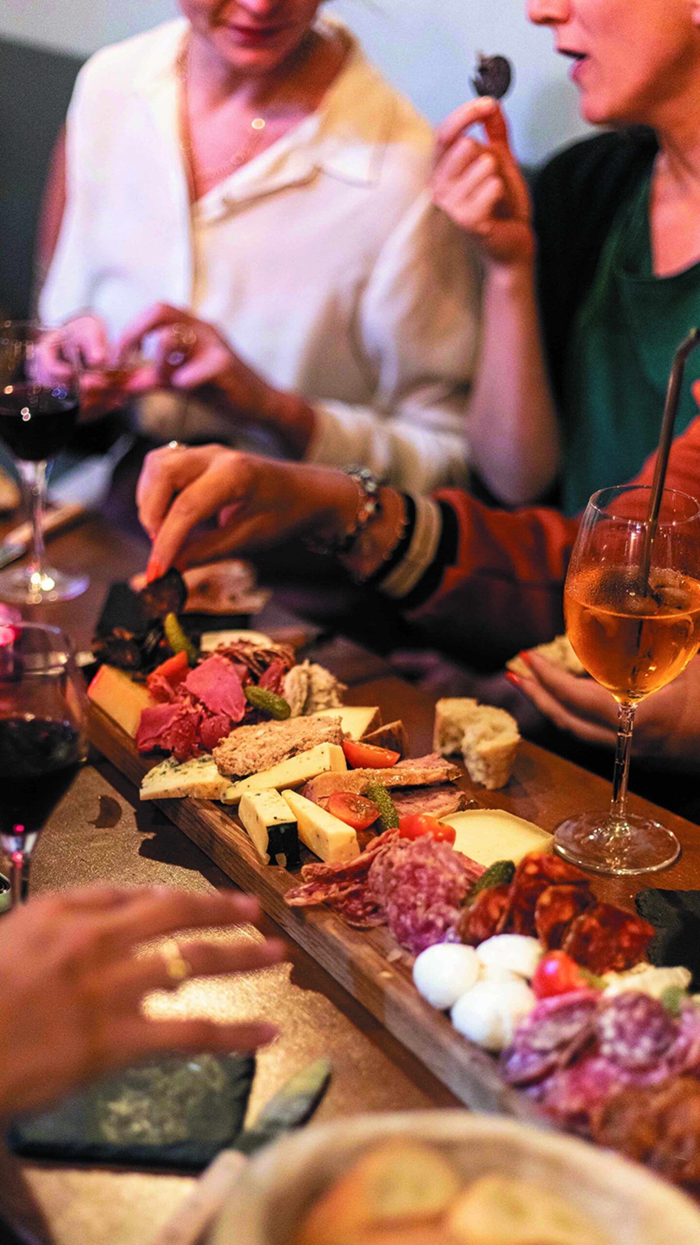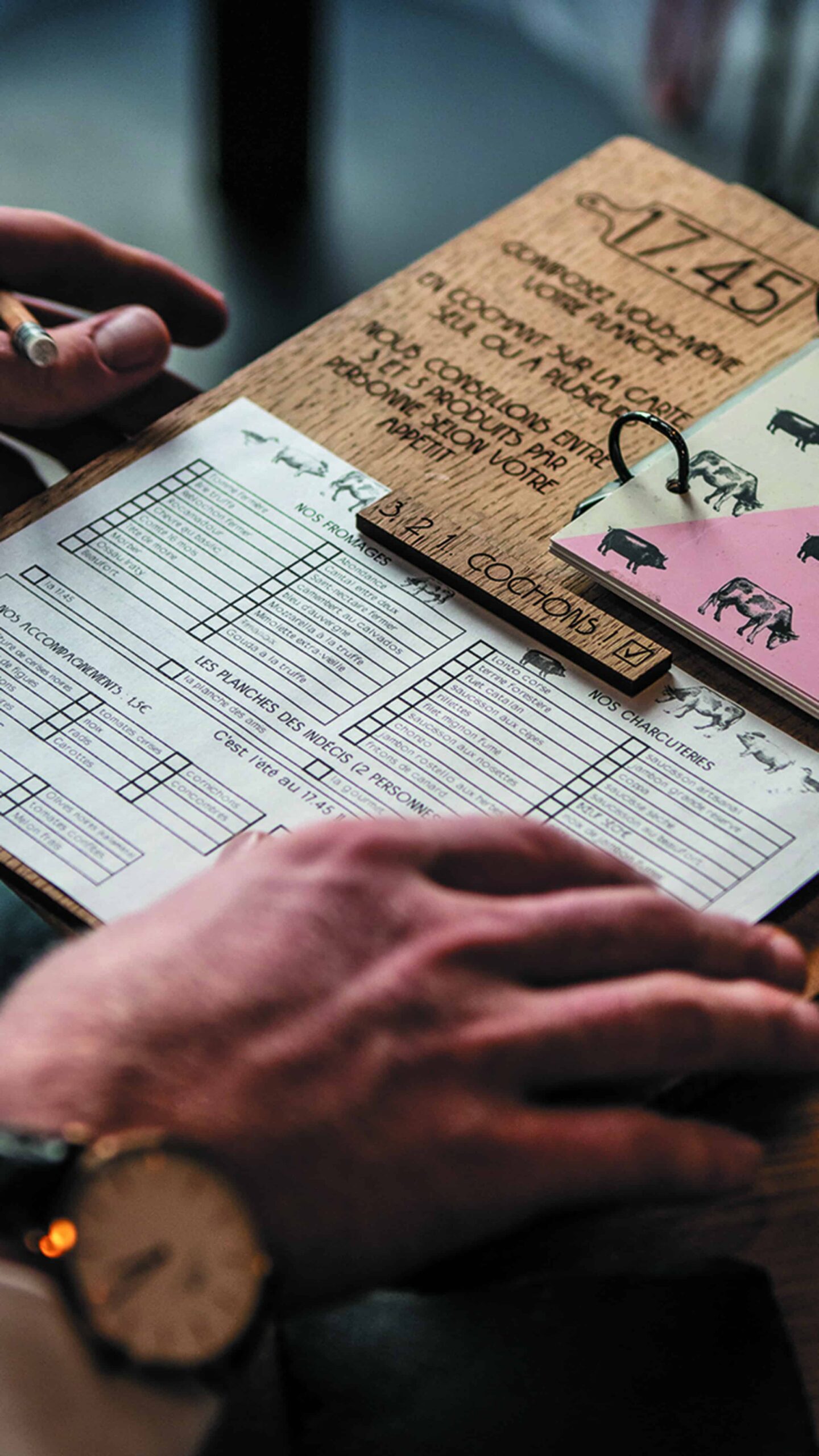 Il faut dire que l’idée est bonne. Il vous suffit de cocher sur une feuille les produits qui composeront votre planche apéro et le tour est joué. La description des produits est indiquée noir sur blanc, impossible de se tromper. Au menu : 20 fromages, 20 charcuteries et une grande sélection d’accompagnements. On retrouve alors de la tomme fermière, de la tête de moine, du gouda à la truffe, du filet mignon fumé, du jambon persillé, des rillettes… Bref, le meilleur de nos terroirs sur une seule planche. La franchise, qui travaille avec des produits de saison, s’approvisionne majoritairement en France. De son côté, Clément s’est rapproché d’acteurs locaux, notamment pour le vin et les bières, qui accompagnent parfaitement l’afterwork. Pendant l’automne, vous pourrez alors découvrir toute une variété de camemberts rôtis. « Même les vegans ne sont pas en reste et pourront composer des planches à base de crudités ». Comme quoi, il y en a pour tous les goûts. Et pour les plus indécis, des planches déjà prêtes sont aussi proposées à la carte. Enfin, que les amateurs de sucré se rassurent, ils n’ont pas été oubliés non plus avec des entremets citron meringué, tiramisus et desserts choco-noisette. Parlons du cadre maintenant. « Ici, nous avons trois salles, trois ambiances, explique Clément en nous faisant découvrir les lieux. Avec une première partie restaurant, une petite cour intérieure et un salon privé à l’arrière. » Banquettes, canapés, tabourets, mange-debout : la décoration aux notes boisées et végétales est un appel aux soirées qui se prolongent jusqu’au bout de la nuit. « Lors des événements privés, le restaurant se transforme même en piste de danse pour finir la soirée en beauté. » Le tout dans une atmosphère chaleureuse et cosy. Pour ceux qui souhaitent profiter d’un apéritif sans sortir de chez eux, c’est aussi possible en se faisant livrer les planches via le site internet ou en ramenant des produits de la petite épicerie signée le 17.45.